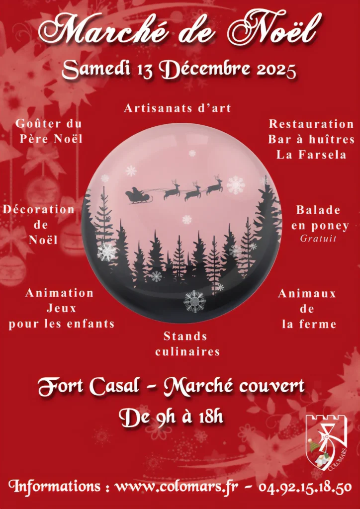 MARCHE COUVERT DE NOEL de 9h à 18h – Salle Louis Bèque et extérieurs du Fort Casal Expo-vente de décorations de Noël. Poteries artisanales, Produits des métiers de bouche (charcuterie. Fromages. Chocolats de Noël. Fruits. Fruits secs et légumes. Miels et déclinaisons, Pâtisseries par le CCAS de Colomars). Vêtements- Nombreuses animations pour les enfants. Tours